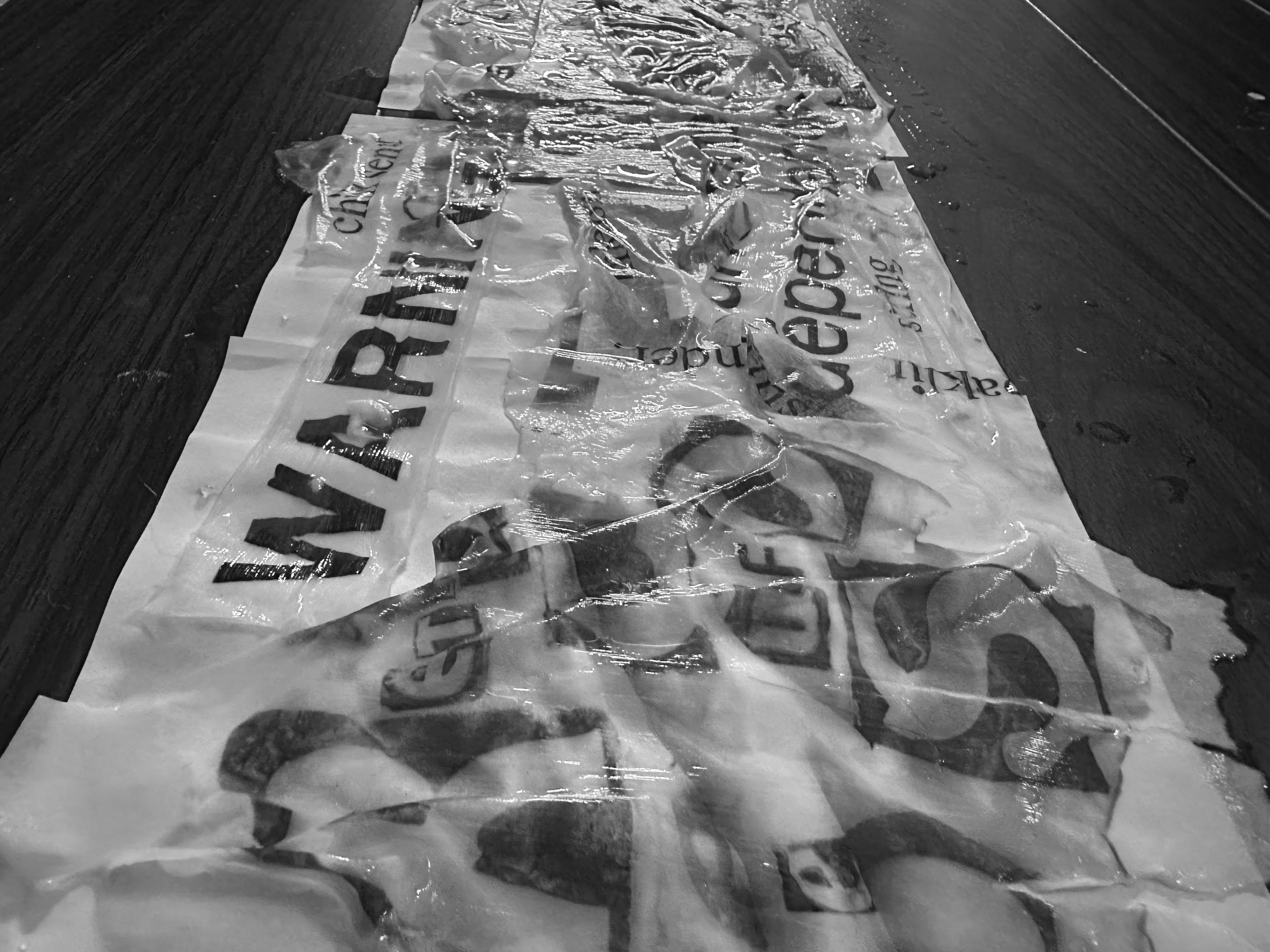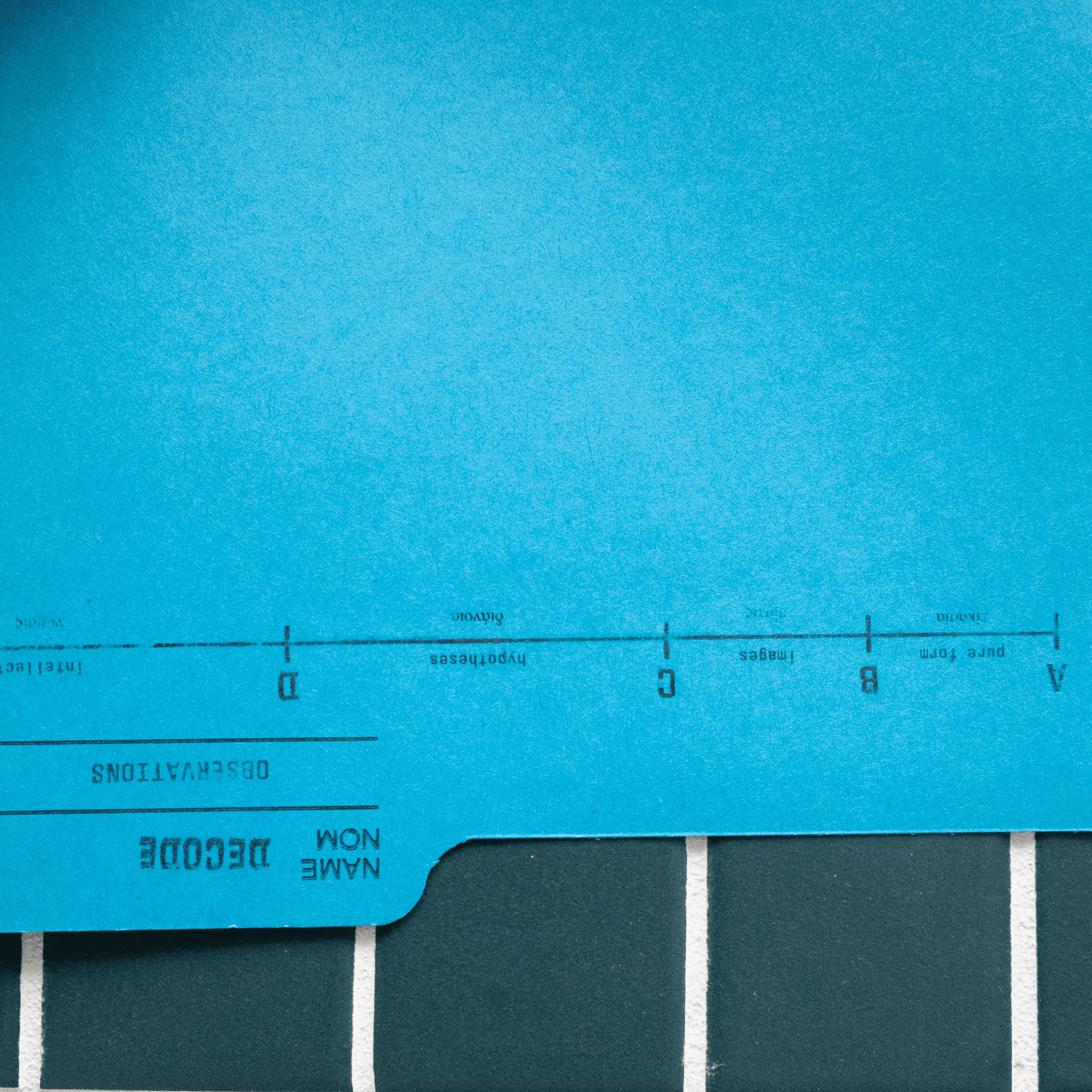 Visual content for DECODE physically collaged using gel-transfer images. Collage was dried, divided into sections and then scanned.