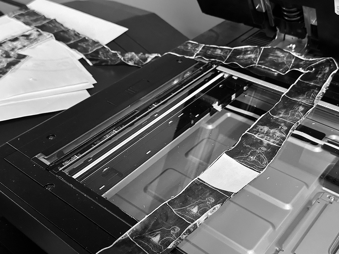 Translucent film is scanned frame-by-frame, where a white square of paper is used to isolate the frame in focus.